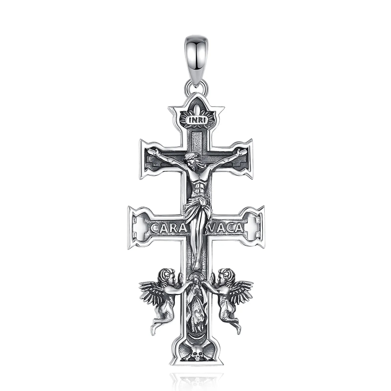 Collier Croix Caravaca en argent sterling 925 Eudora – Pendentif Croix orthodoxe Jésus Ange | Bijou chrétien catholique, cadeau pour hommes et femmes