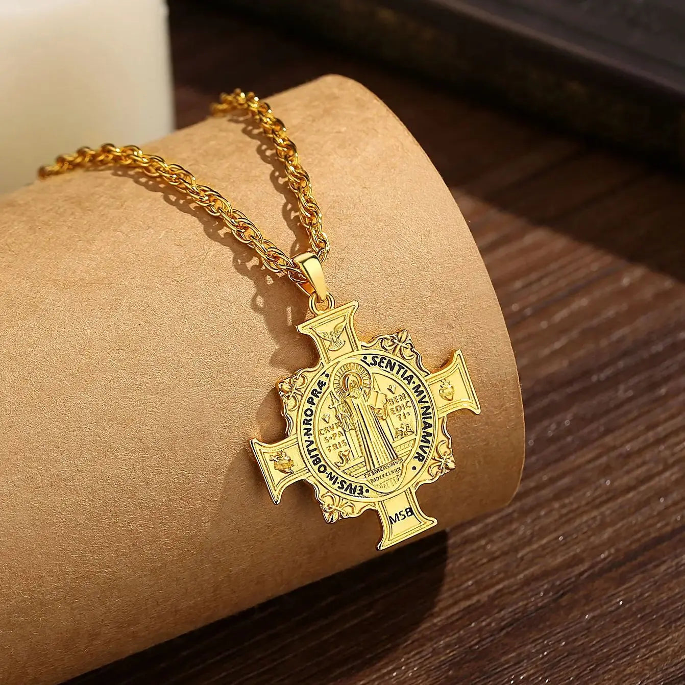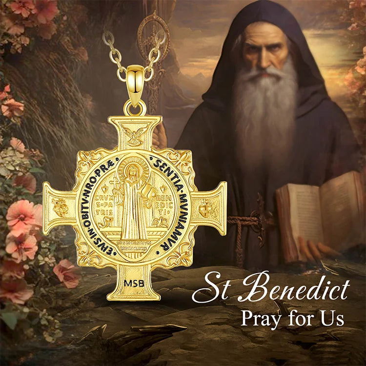 Collier Eudora en argent sterling 925 avec pendentif croix et médaille de Saint Benoît – Plaqué or 18 carats | Bijou de protection chrétien pour homme