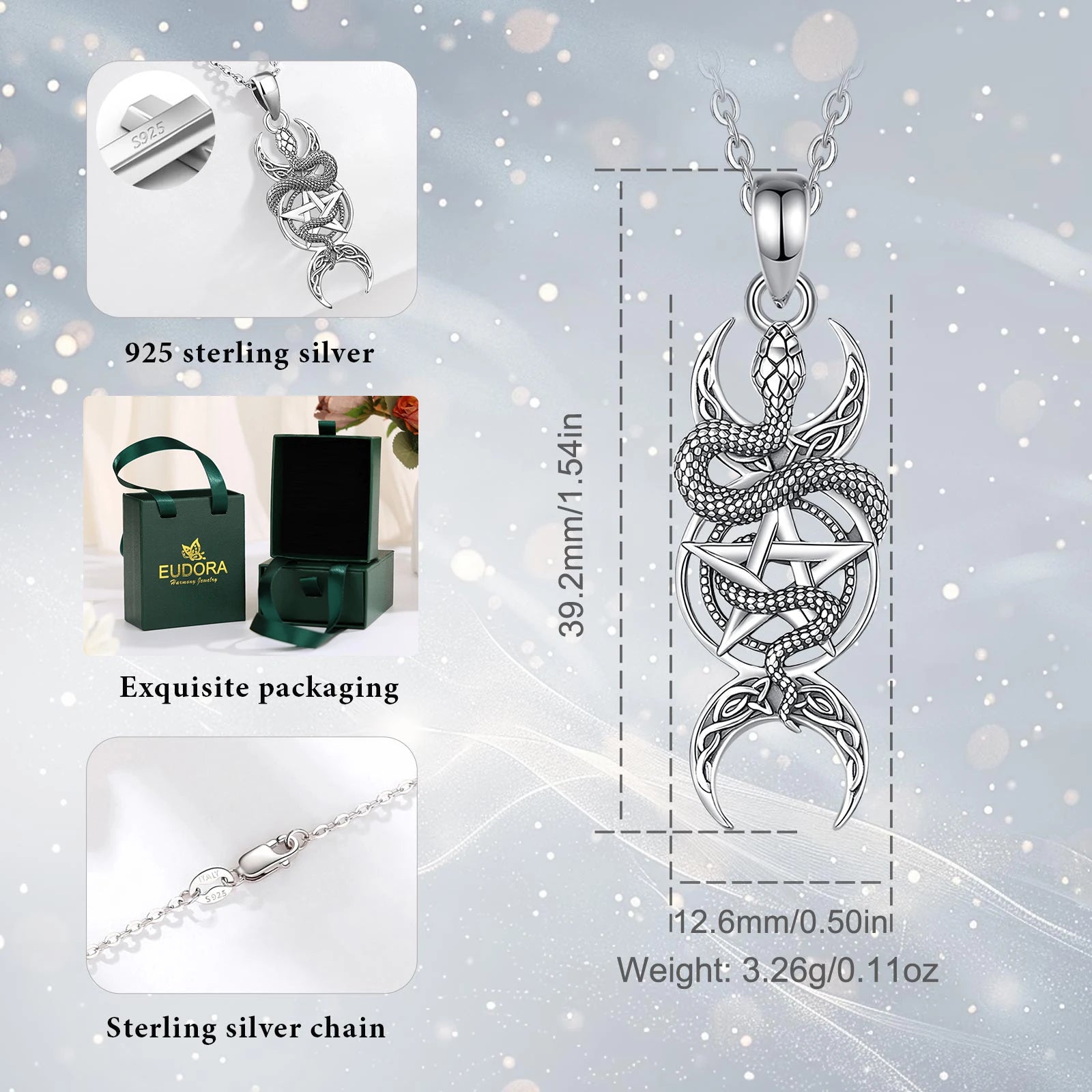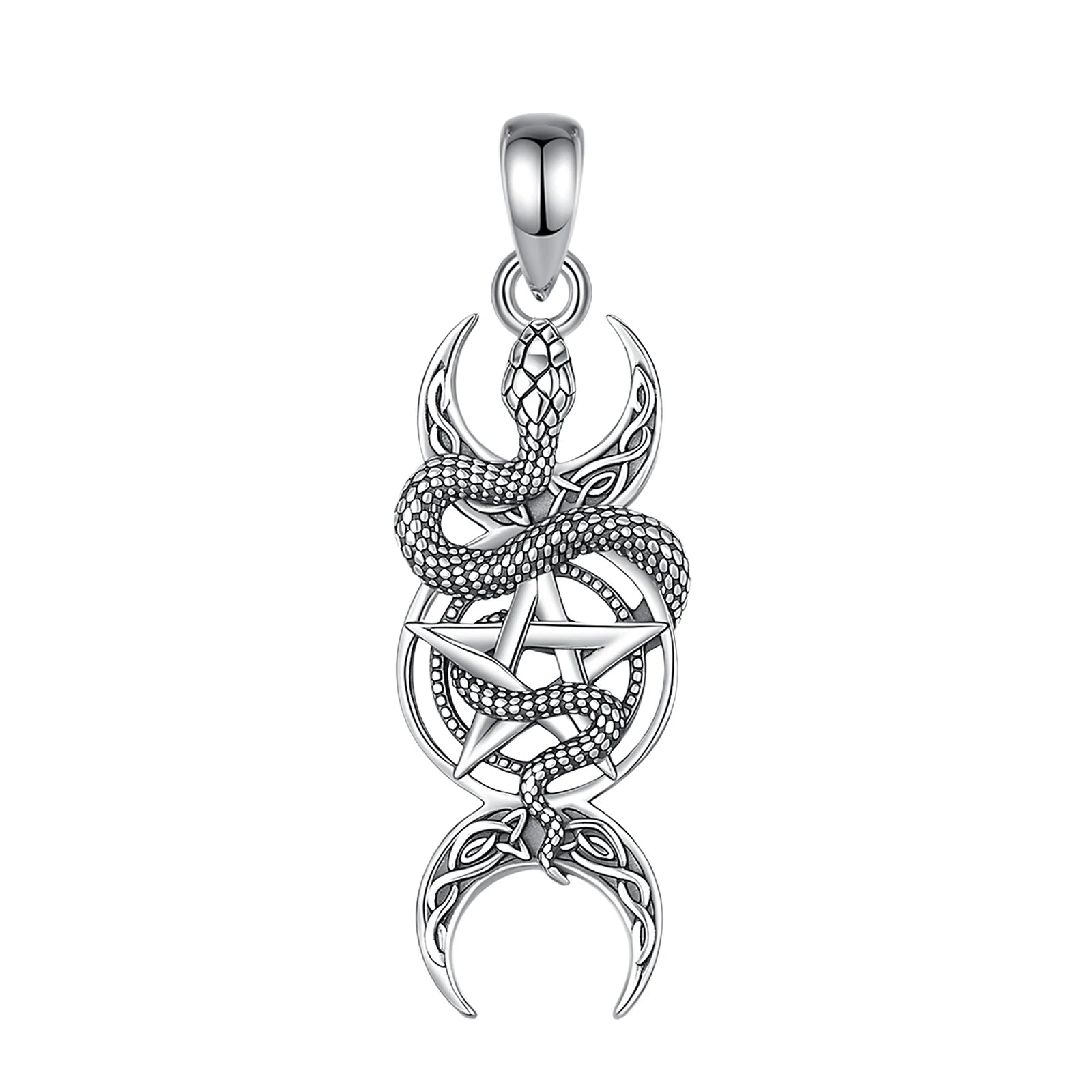 Collier Eudora en argent sterling 925 avec pendentif pentagramme serpent et triple lune, amulette, bijou wicca païen, cadeau pour femme ou homme.
