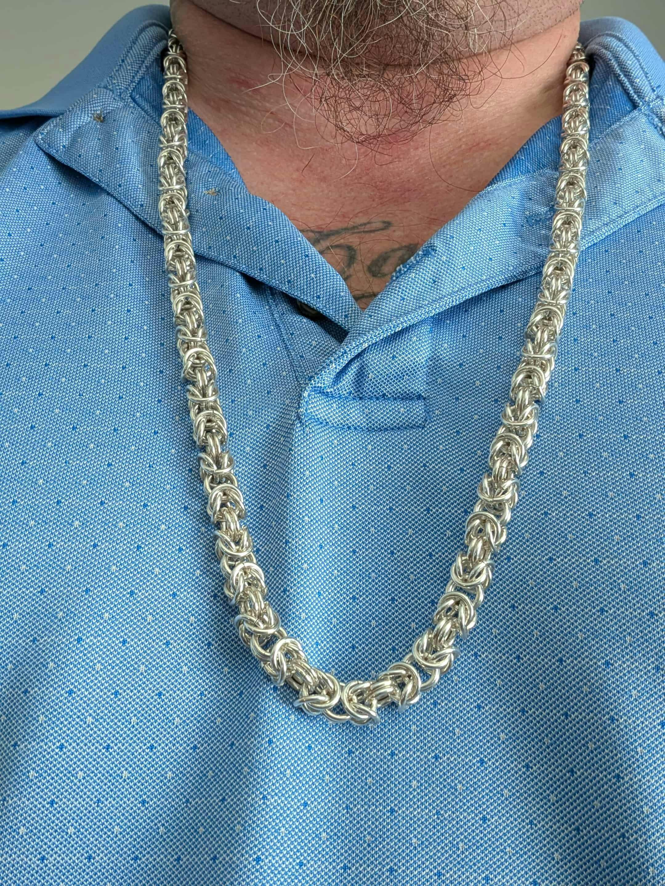 Chaque maillon byzantin est formé, découpé et assemblé à la main à l’aide de gabarits et de mandrins de précision. Nos alliages sont conçus pour offrir à la fois robustesse et confort, avec une teneur en argent contrôlée pour une couleur riche et une performance hypoallergénique. Le résultat : une chaîne à la chute souple, à la structure régulière et à la sensation équilibrée et substantielle sur le cou.
